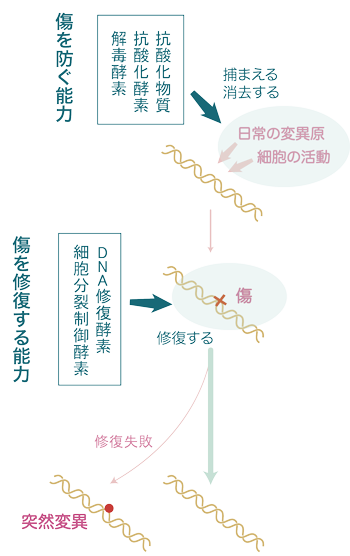 遺伝子(DNA)に突然変異ができるのは、遺伝子にできた傷を正しく修復できなかった場合ですが、 1)傷を防ぐ機能(抗酸化系、解毒系) に分けることができます。 現実の細胞では、下図のような攻防が繰り広げられた結果として、まれに突然変異ができてしまうのです。
